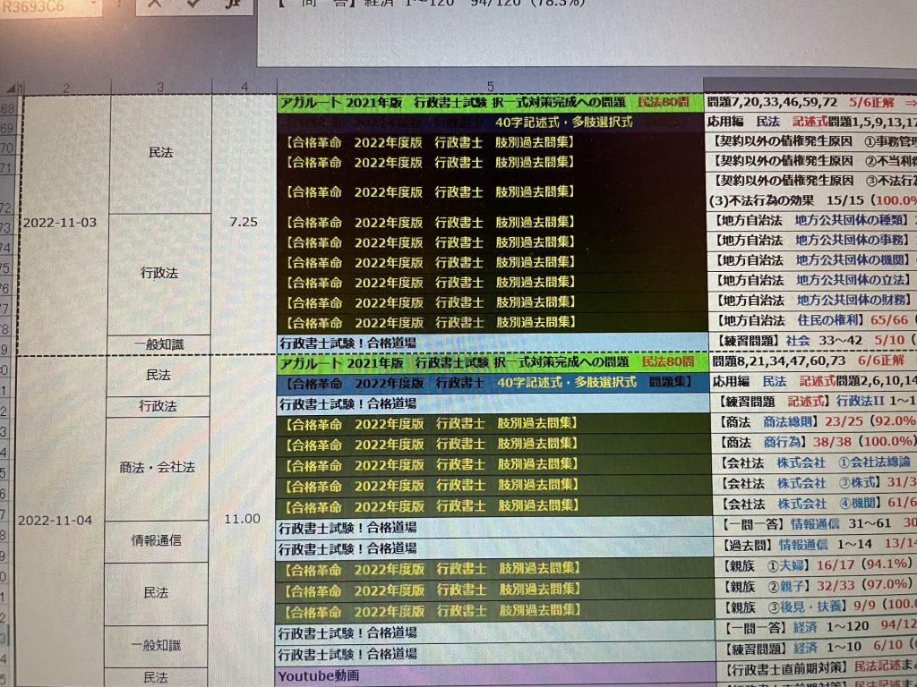 行政書士試験は毎年11月の第2日曜日に行われる。よって、令和6年度行政書士試験の実施日は11月10日だ。本日は10月31日なので、正に試験の10日前ということになる。私は令和4年度行政書士試験(令和4年11月13日実施)を受けたのだが、2年前のこの時期(試験10日前)に一体何をしていたのだろうか?ということで、令和4年11月3日(試験の10日前)の学習履歴(エクセル)を読み返してみた。添付エクセル画像からお分かりのように、民法及び行政法を中心に【合格革命 2022年度版 行政書士 肢別過去問集】の問題を解いていた(問題を読んで正誤判定)。2年ぶりに939ページからなる【合格革命】の本を開いてみると、8周目に突入していたことが分かる。民法(事務管理、不当利得、不法行為に関する設問)は、60問中59問正解で98.3%の正解率。一方、行政法(地方自治法に関連する設問)は、230問中215問正解で93.5%の正解率。8周目(8回目)にもかかわらず、全問正解するのは極めて困難なのだ。とにかく試験科目が多く、沢山の条文や判例を理解・記憶する必要があるのに、悲しいかな忘却するするスピードに負けてしまうのだ。11月3日の学習時間は7時間15分だが、11月4日になると11時間学習していたことが分かる。最後の「もがき」といえばそれまでですが、ウォーキング、買物、食事、お風呂・トイレ以外は学習していたという感じでした。さて、令和5年度の受験者数は46,991人で6,571人が合格(合格率:13.98%)しましたが、令和6年度行政書士試験はどうなるのでしょうか? 初挑戦する人、リベンジで受験する人、様々な人が受験すると思いますが、最後まで諦めずに頑張って欲しいと思います。当日までもさることながら、試験中(3時間)も時間配分やマークシートの記入ミス等に注意して頑張ってください。残り10日間、くれぐれも健康に気を付けて・・・I wish you good luck.